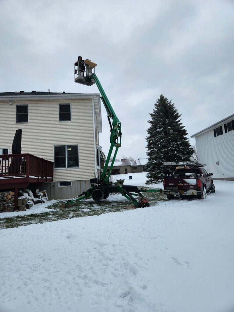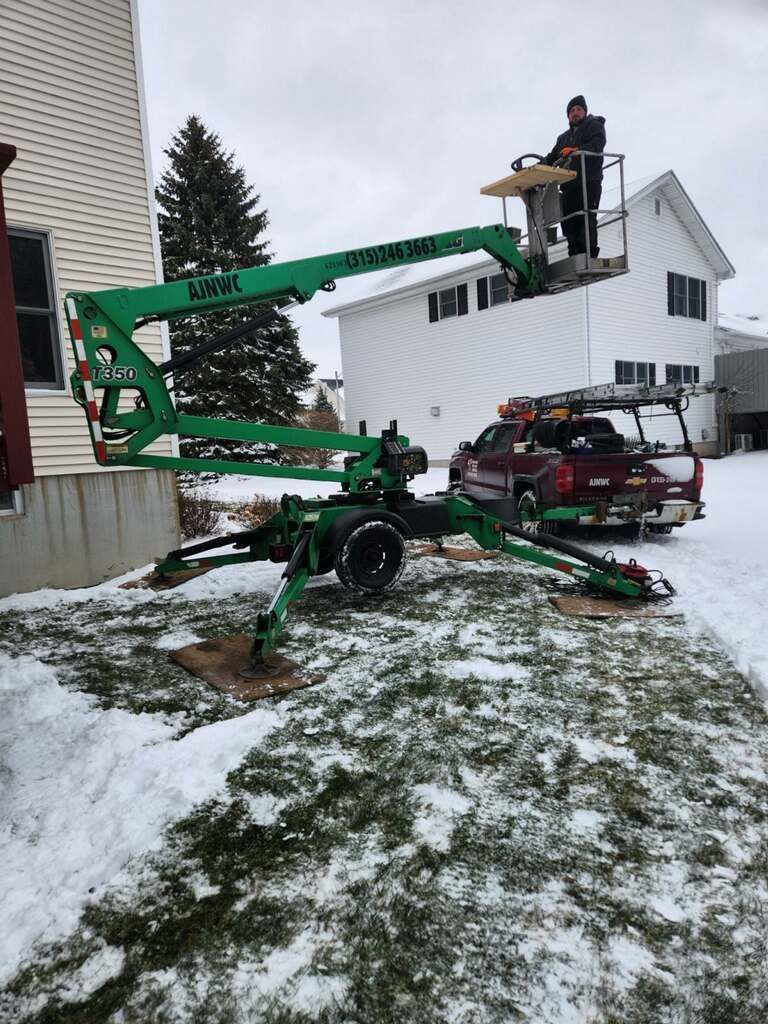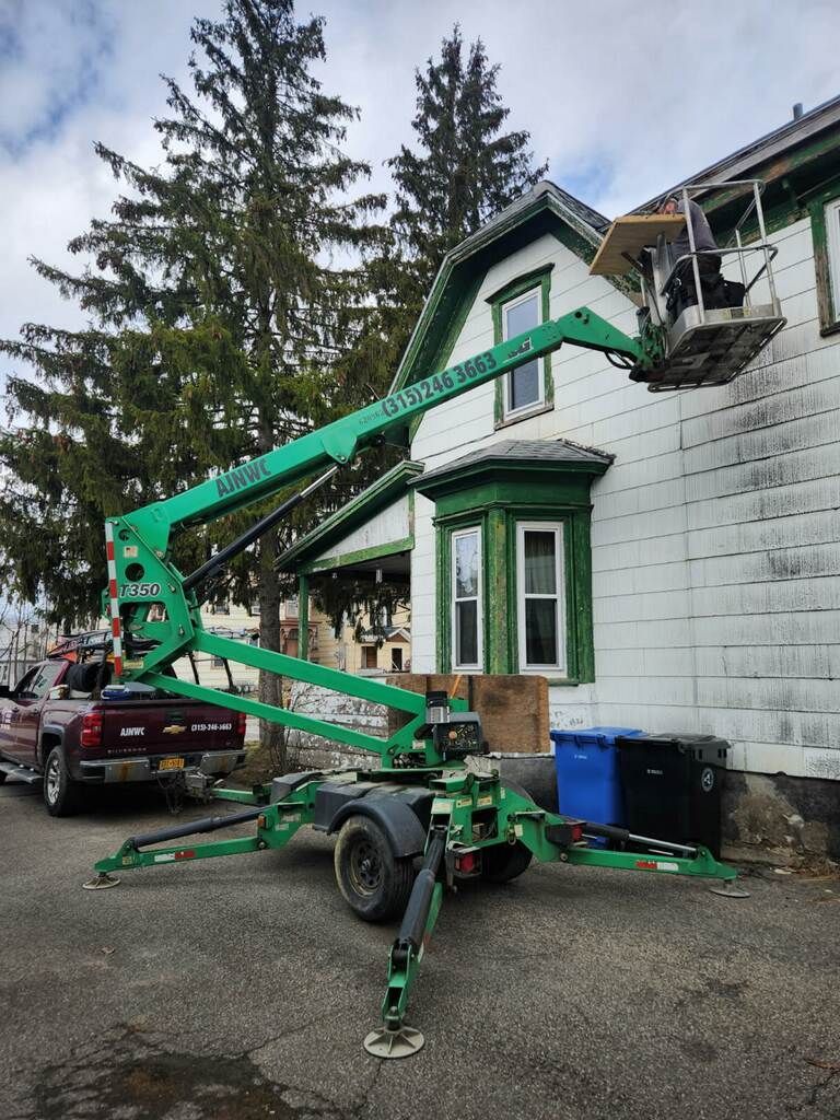 A green boom lift positioned near a white house; a person is working. A white pickup truck is parked in the driveway.