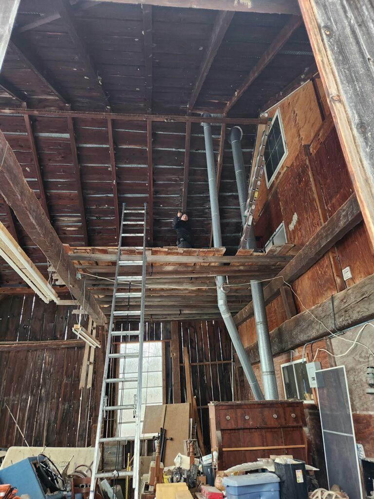 Green lift inside a barn, working on the ceiling. Cows are in stalls on both sides.
