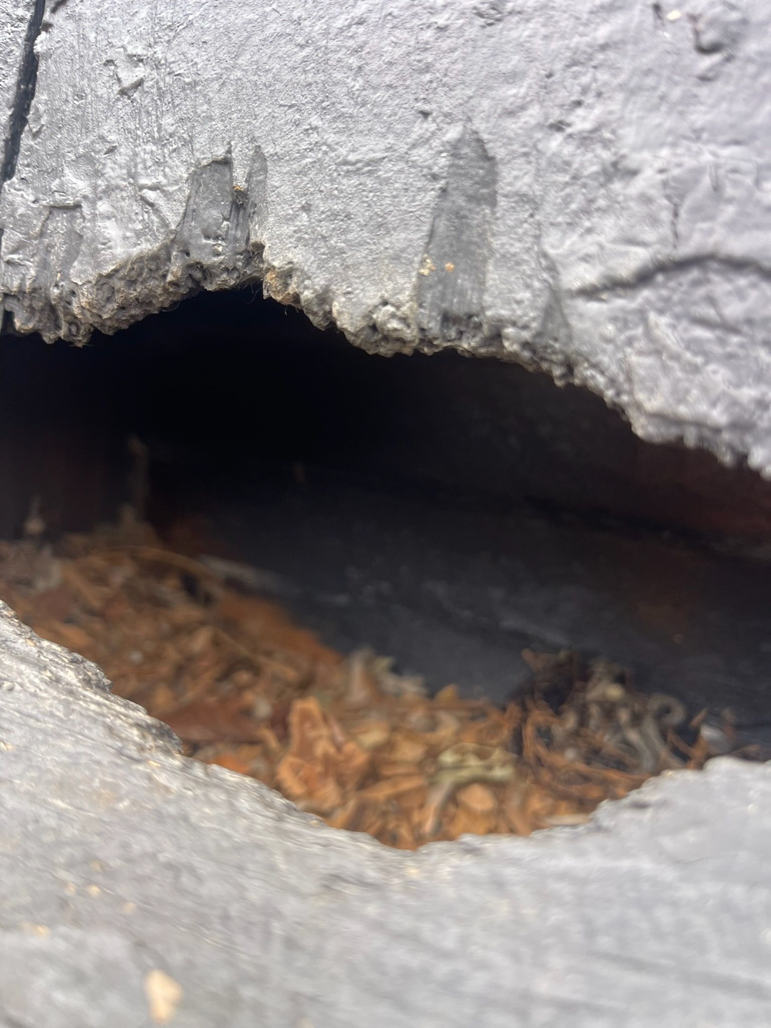Brick chimney on a dark roof against a blue sky, surrounded by bare tree branches.