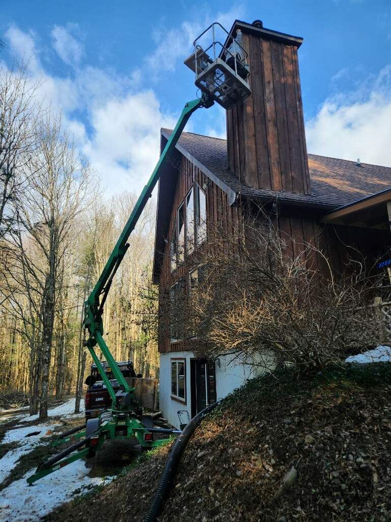 Person on a ladder, working on a chimney attached to a white house with windows and an AC unit.