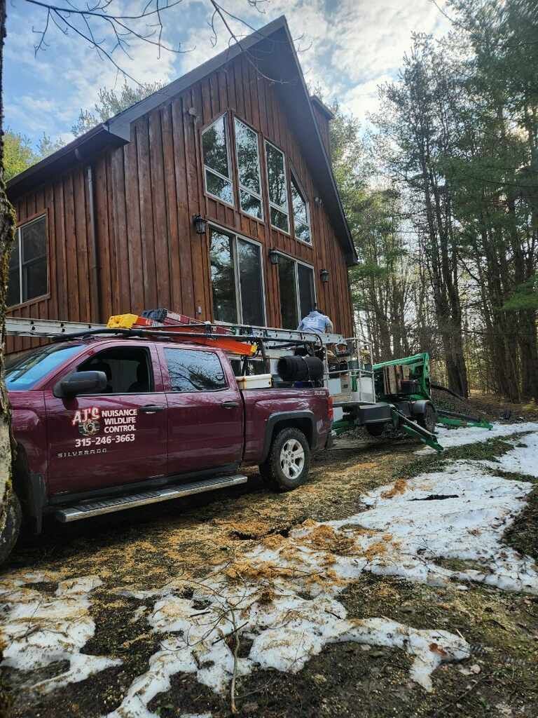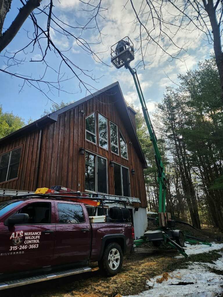 A truck from AJ's Nuisance Wildlife Control is parked in front of a house, and a person in a lift is working on the roof.